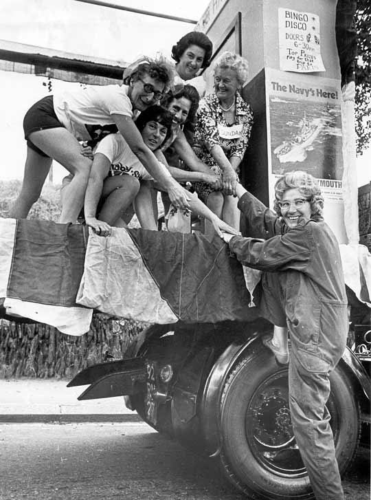 Photo: Winnie climbing aboard a Devonport Carnival float - early 1970s.
